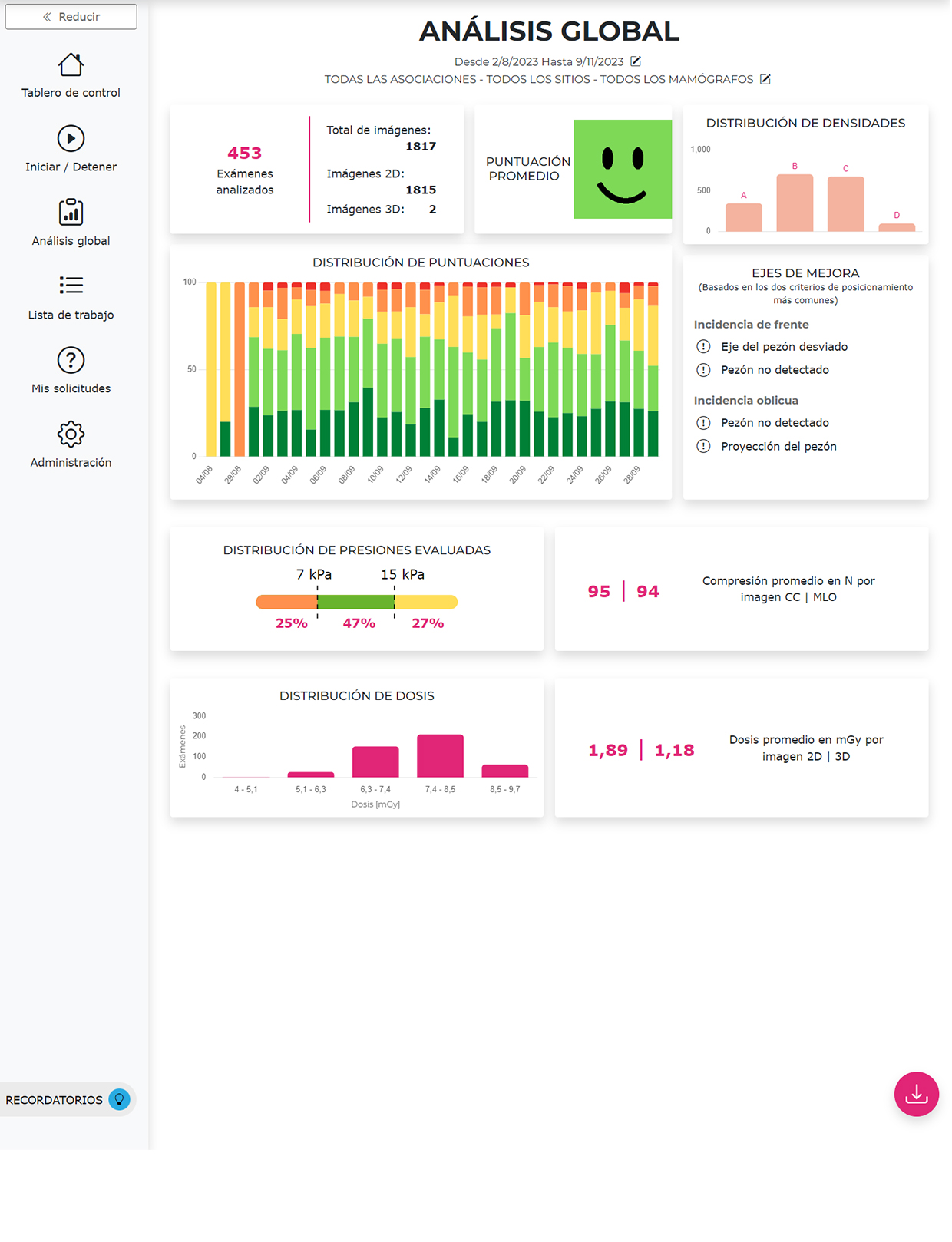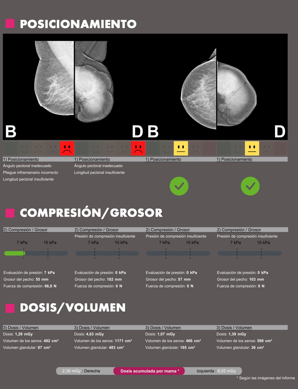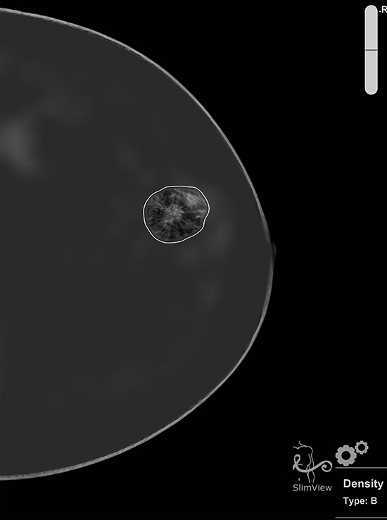 Incluída dentro de la suite Breast-SlimView®. la "MAMMOGRAPHY TECHNICAL EVALUATION" otorga información al radiólogo para la toma de desiciones mediante el analisis específico del posicionamiento, compresión, densidad mamaria y la dosis de radiación recibida en cada una de las proyecciones.