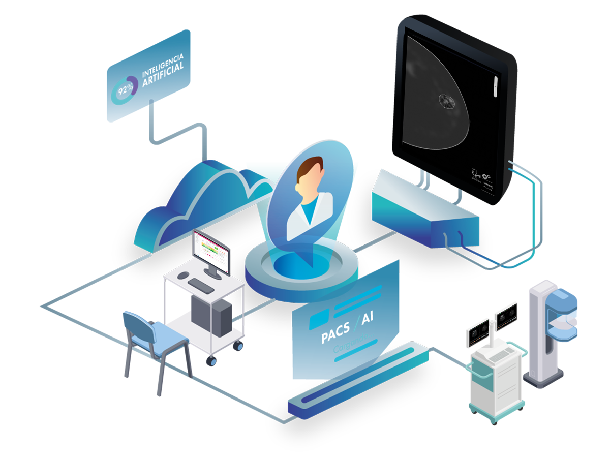 Es capaz de recibir datos del sistema de adquisición de imágenes radiográficas mamarias y procesarlos mediante su Inteligencia Artificial en cuestión de segundos, además, puede inyectar sus propios datos en el mismo flujo de trabajo para enriquecer la toma de decisiones, sin afectar la productividad del médico radiólogo.